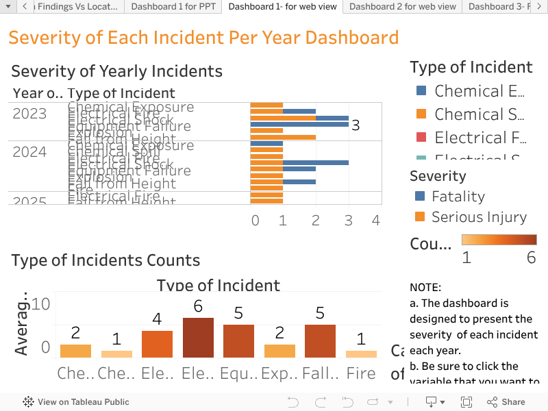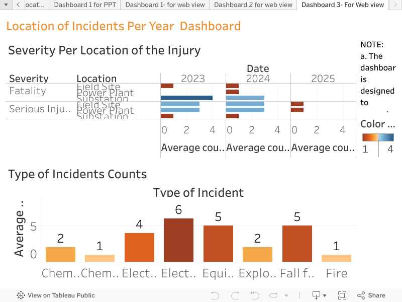 <script type='text/javascript'> var divElement = document.getElementById('viz1718120241290'); var vizElement = divElement.getElementsByTagName('object')[0]; if ( divElement.offsetWidth > 800 ) { vizElement.style.minWidth='1600px';vizElement.style.maxWidth='100%';vizElement.style.minHeight='950px';vizElement.style.maxHeight=(divElement.offsetWidth*0.75)+'px';} else if ( divElement.offsetWidth > 500 ) { vizElement.style.minWidth='1600px';vizElement.style.maxWidth='100%';vizElement.style.minHeight='950px';vizElement.style.maxHeight=(divElement.offsetWidth*0.75)+'px';} else { vizElement.style.width='100%';vizElement.style.minHeight='1300px';vizElement.style.maxHeight=(divElement.offsetWidth*1.77)+'px';} var scriptElement = document.createElement('script'); scriptElement.src = 'https://public.tableau.com/javascripts/api/viz_v1.js'; vizElement.parentNode.insertBefore(scriptElement, vizElement); </script>- To use create a web based platform that aggregates data involving injuries and fatalities in Electrical Field Industry